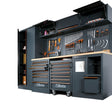 Wall storage: 3 × perforated panels, 3 × wall cabs with lift‑up doors, 3 × wide & 1 × narrow bracket