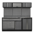 Includes 7-drawer floor cabinet, wall cabinets, tambour storage, back panels, and uprights
