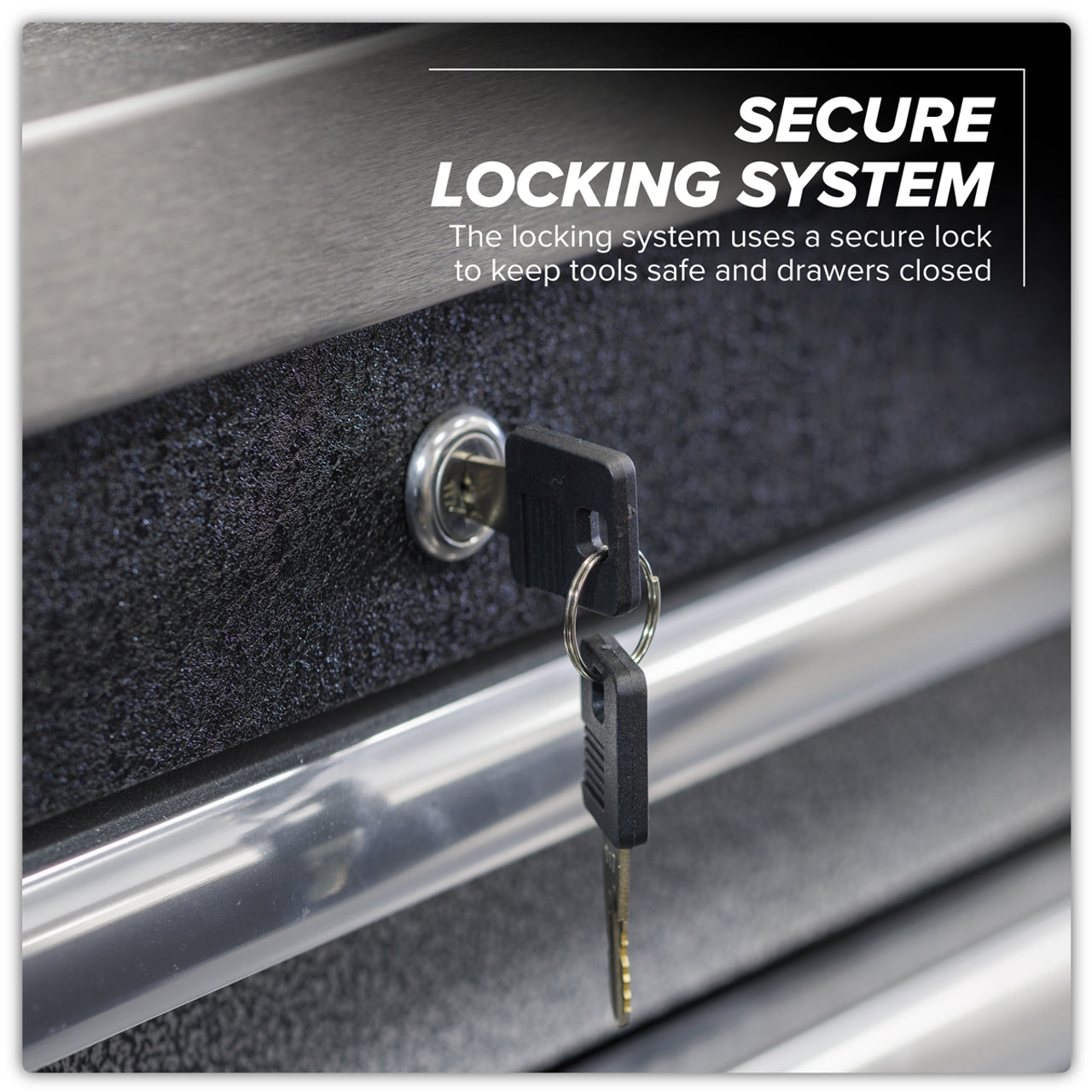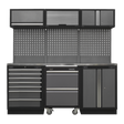 Constructed from heavy-duty steel with a durable hammered-metal finish, this system combines drawer storage, wall cabinets, a mobile workshop trolley, and full back panel coverage for a clean, professional look. Aluminium handles, gas-strut wall cabinets, and smooth ball-bearing drawers ensure effortless operation and reliability day after day.