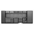 Constructed from heavy-duty steel with a hammered-metal finish, this 4.92m system combines floor cabinets, tall lockers, wall units, tambour storage, and a mobile workshop trolley into one integrated solution. Every component — from the ball-bearing drawer slides to the aluminium handles and gas-strut wall cabinets — is built for smooth operation and lasting durability.